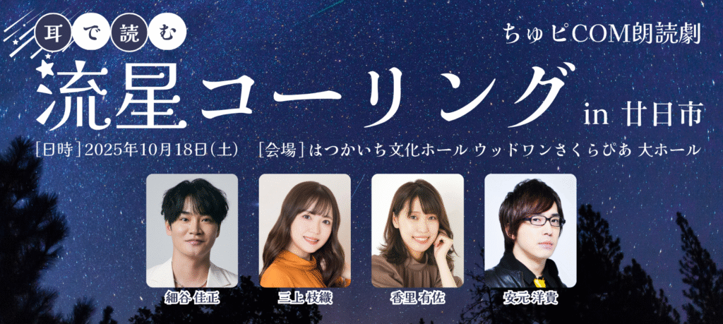 耳で読む-ちゅピCOM朗読劇の「流星コーリング」in廿日市が2025年10月18日(土)はつかいち文化ホール ウッドワンさくらぴあ大ホールで開催されます。