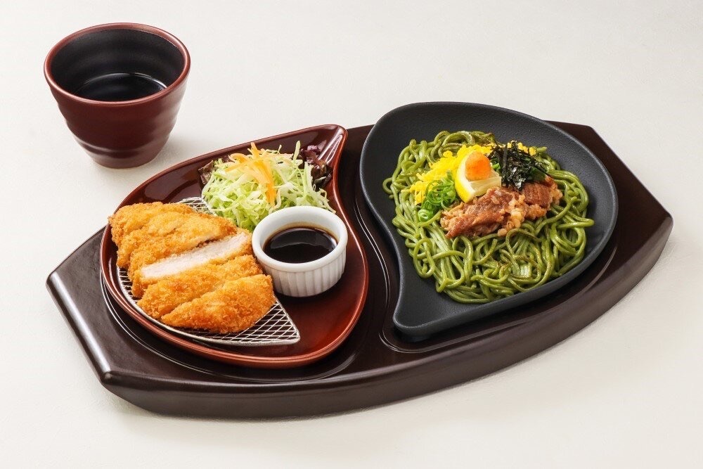 三元豚のロースとんかつと、瓦そば風に熱々の鉄板で香ばしく仕上げた茶そばを一度に楽しめる贅沢なセット。サクサク食感のとんかつと、風味豊かな茶そばの組み合わせが食欲をそそります。価格は1,380円(税込)、11:00〜21:00(ラストオーダー20:30)までご提供しています。