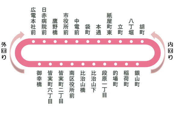 この路線は、「広電本社前」を起点に、紙屋町・八丁堀といった都心部と、皆実町・比治山エリアを円を描くように結ぶルートです。