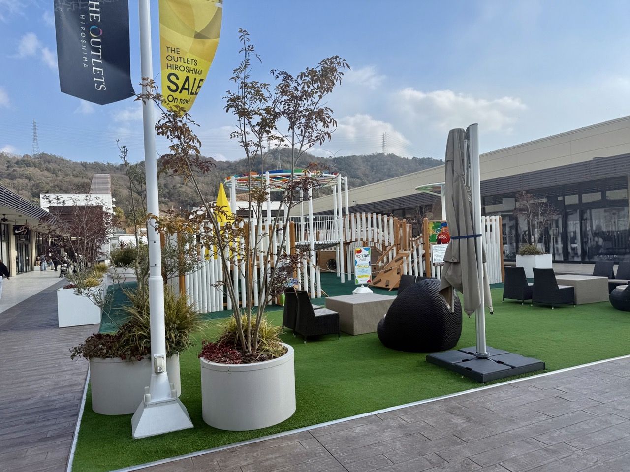 施設周辺には無料で遊べる屋外キッズ広場や芝生スペースがあり、天候の良い日はピクニック気分で過ごせます。
