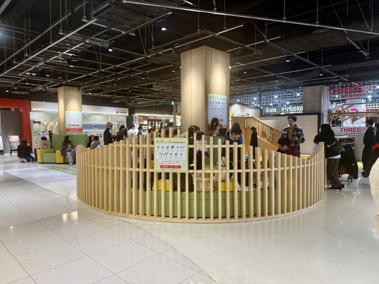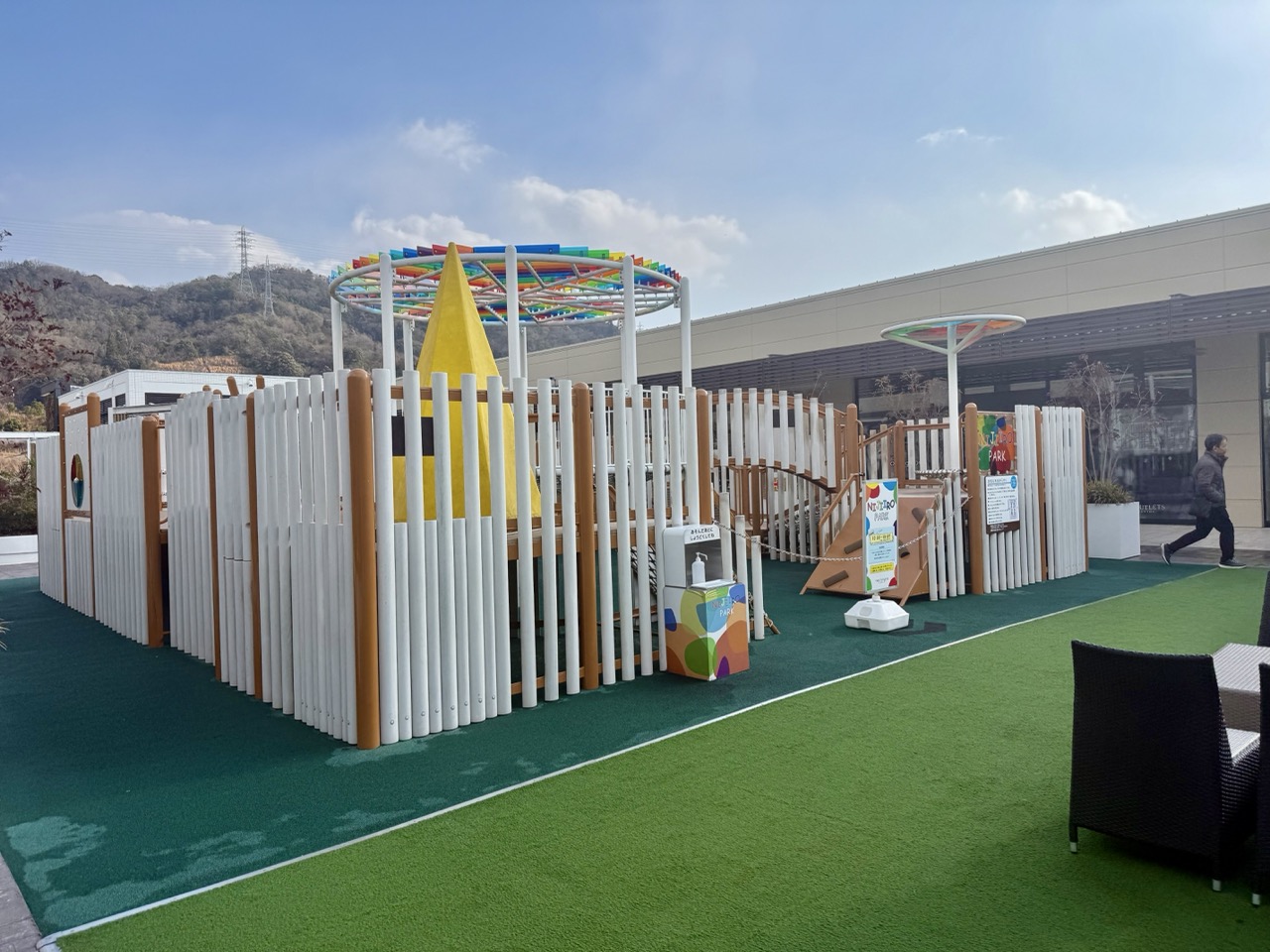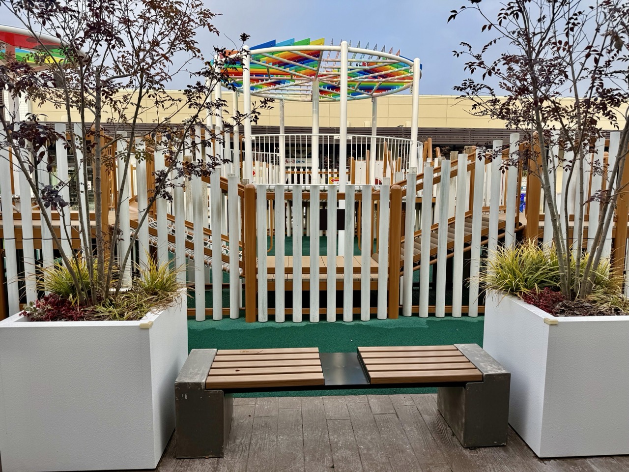 2021年のリニューアルで誕生した「NIJIIRO PARK(にじいろパーク)」は、3~12歳の子どもが楽しめる大型遊具エリア。利用時間は10:00~18:00(10~2月は17:00まで)で、ショッピングの合間の遊び場としてぴったりです。遊具は全体的に低めに設計されており、保護者の目が届きやすく安心。すぐそばにはイスやテーブルも設置されているため、休憩やおやつタイムにも便利です。