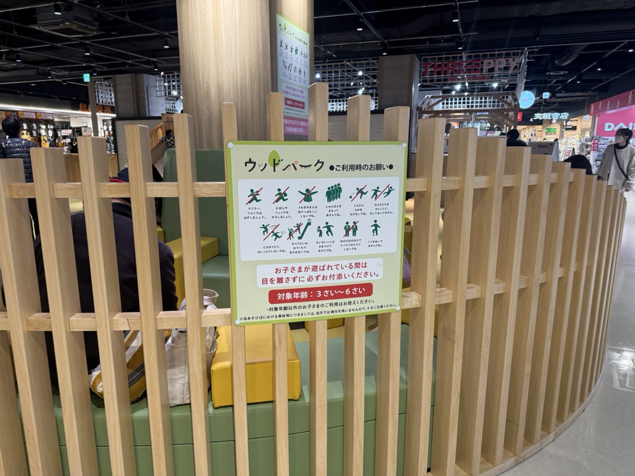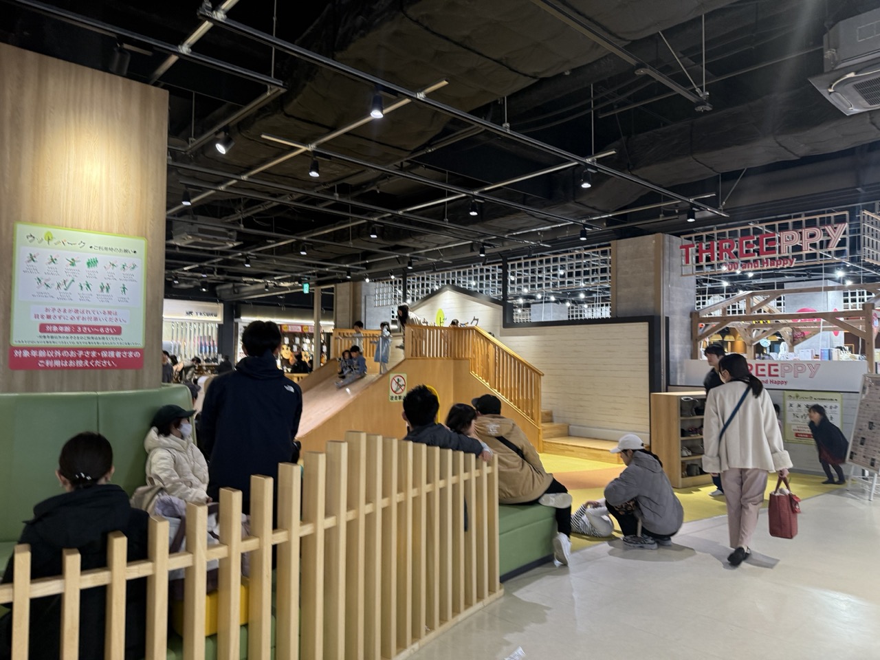 3~6歳を対象とした「ウッドパーク」には、木製の大きなすべり台をはじめ、木のぬくもりを感じられる遊具が揃っています。靴を脱いで過ごすエリアのため、小さな子どもも安心して遊べるほか、保護者にとっては休憩スポットとしても利用しやすい空間です。