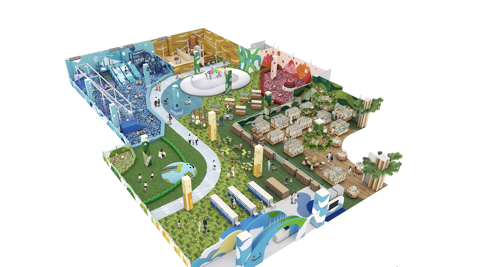 自然や地球をテーマにしたやさしいデザインで、すべり台・ボールプール・ごっこ遊びコーナーなどが充実しています。