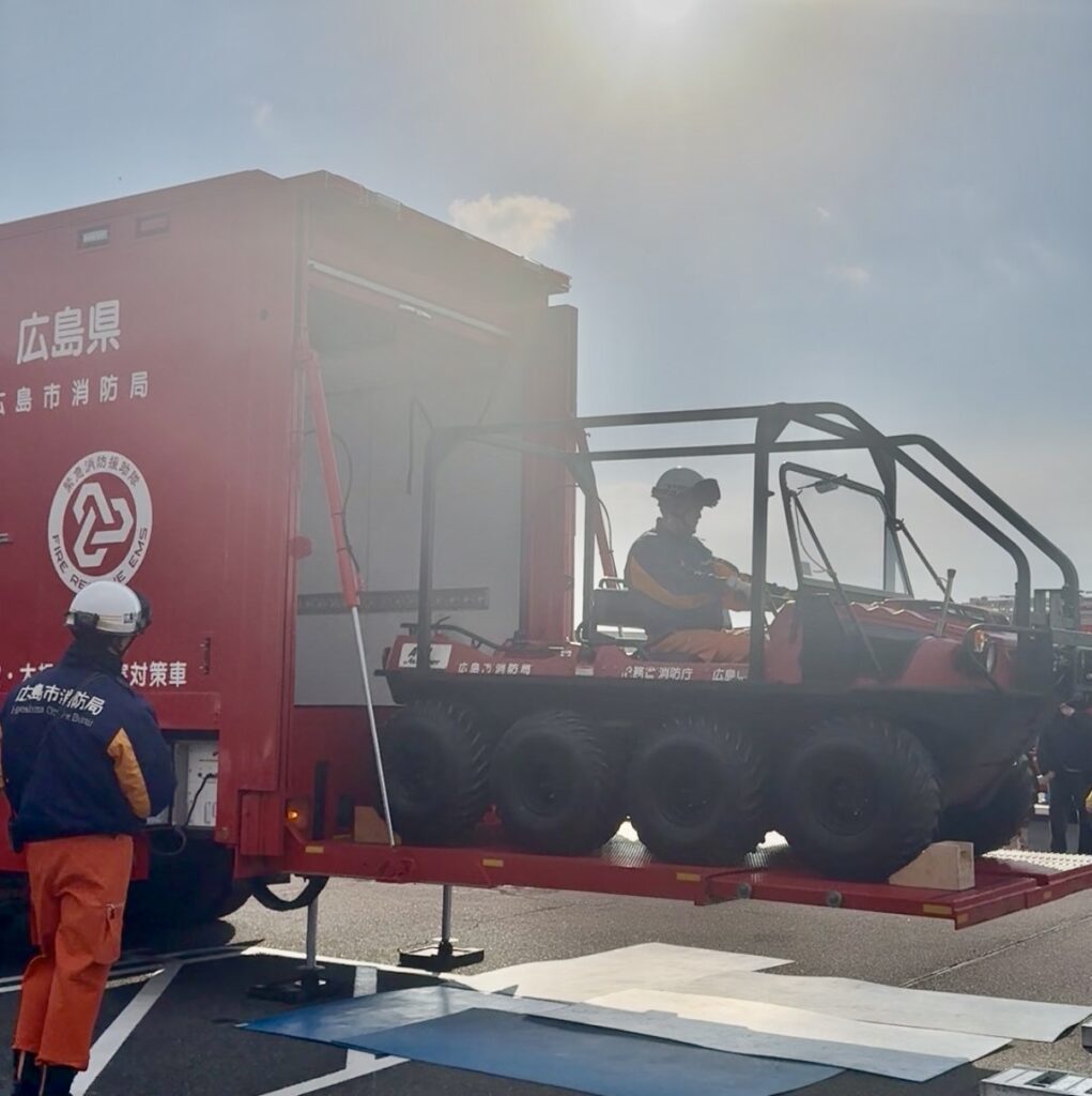 起震車(地震体験車)・水陸両用バギーの展示や写真撮影ができます。