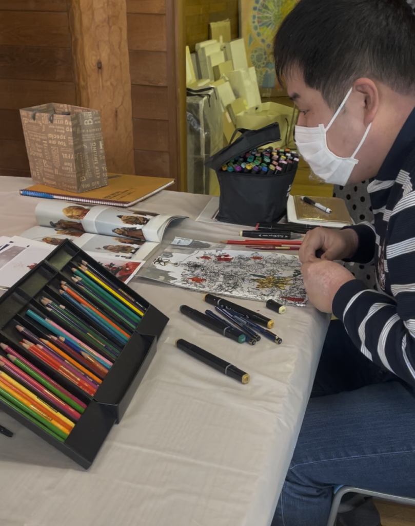 1996年広島県生まれ。安芸郡坂町在住。発語は少なく、いろいろなジェスチャーや表情で思いを伝える。絵を描くことも、内に秘めた思いを伝える大切な1つの手段となっている。小さな頃からアニメが大好きで、アンパンマンやドラえもんなどの様々な場面を描きこなす。11歳から本格的に絵画活動を開始。洗練された線とスピーディーな描きっぷりが特徴的。18歳の頃コピックのマーカーと出合い、新たな色の世界が生まれる。絵を描くことが日課となり、驚くほどの集中力で描き進める。描く対象は、人間も含め生き物全般と植物など幅広い。