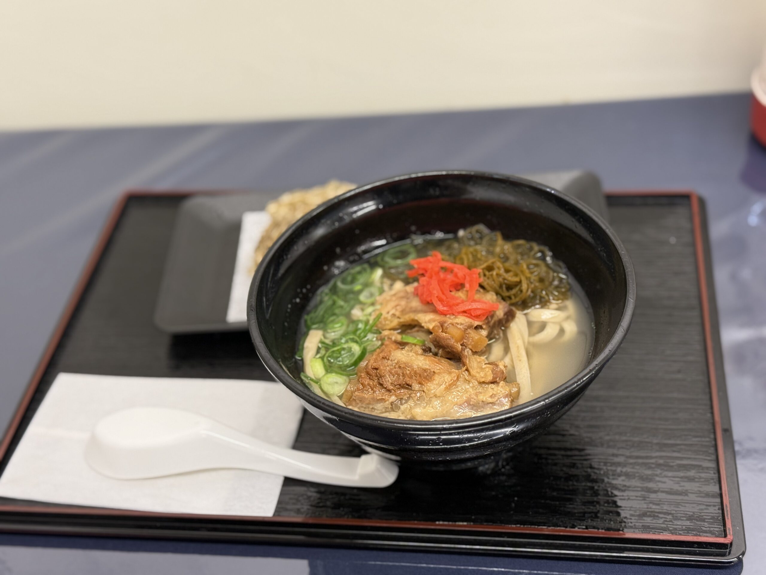 そば自体に 沖縄県産のもずくを練り込んだ麺 を使用し、海の風味と旨味がそばにしっかり溶け込んでいます。ソーキ(豚の軟骨付きスペアリブ)は柔らかく、濃厚なだしとの相性が抜群です!